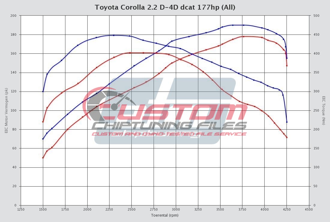 Custom-Chiptuningfiles is leading in the development of Toyota Corolla 2.2 D-4D dcat 177hp tuning files. The development of each Toyota Corolla 2.2 D-4D dcat 177hp tuning file is the result of perfection and dedication by Custom-Chiptuningfiles programmers. The organization only uses the latest technologies and has many years experience in ECU remapping software. Many (chiptuning) organizations around the globe download their tuning files for Toyota Corolla 2.2 D-4D dcat 177hp at Custom-Chiptuningfiles for the best possible result. All Toyota Corolla 2.2 D-4D dcat 177hp tuning files deliver the best possible performance and results within the safety margins.